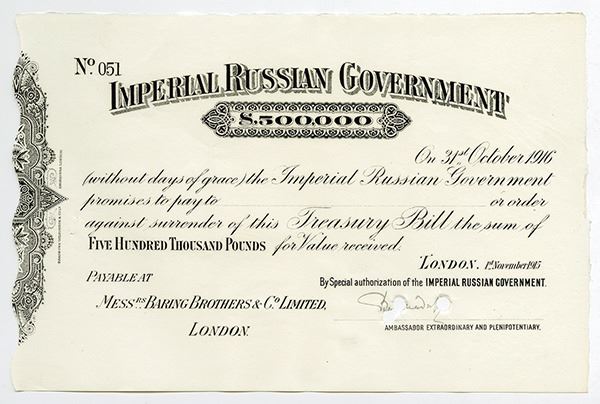 London, England. Issued on 1st November 1915 and Due 31st October 1916. Issued and cancelled £500,000 Treasury Bill, Black on white paper, Counterfoil on left with wavy cut, curved title, Punched out cancels in signature area, S/N 051, XF to AU condition. Scarce Russian Pre World War I fiscal document. BW&C.