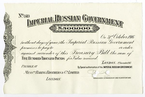 London, England. Issued on 1st November 1915 and Due 31st October 1916. Issued and cancelled £500,000 Treasury Bill, Black on white paper, Counterfoil on left with wavy cut, curved title, Punched out cancels in signature area, S/N 049, XF to AU condition. Scarce Russian Pre World War I fiscal document. BW&C.