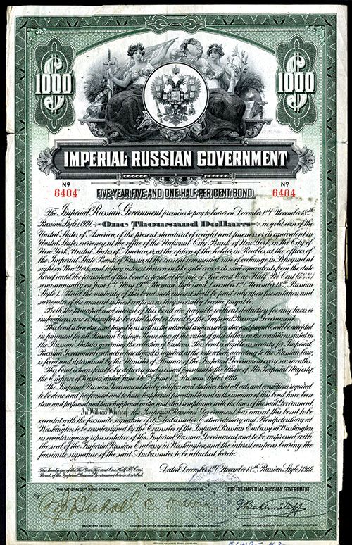 Russia, 1916, $1000, I/U bond, Arms of Imperial Russia on top flanked by allegorical women on green border and underprint, 5 coupons attached, S/N 6404, Fine condition with small spits at folds and some toning . ABNC.