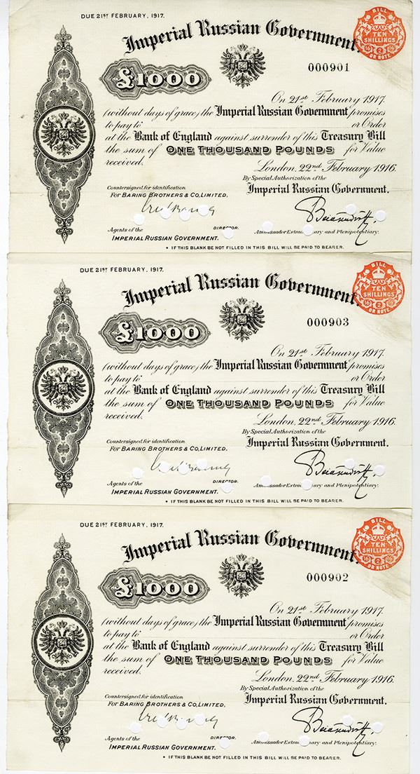 London, England. Lot of 3 Treasury Notes, Issued on February 22nd, 1916 and Due February 21st, 1917. Issued and cancelled £1000 Treasury Bills, Black on white "Bank of England" watermarked paper, Russian Imperial arms at left on counterfoil, and small version at top under curved title, Red 10 Shillings Imprinted revenue stamp on the top right corner, Punched out cancels in signature area, S/N's 000901; 000902 and 000903, XF to AU condition. Scarce Russian Pre World War I fiscal documents. Printed by the Bank of England.