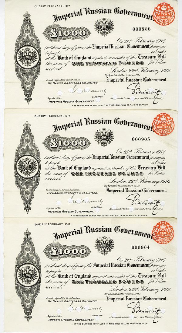 London, England. Lot of 3 Treasury Notes, Issued on February 22nd, 1916 and Due February 21st, 1917. Issued and cancelled £1000 Treasury Bills, Black on white "Bank of England" watermarked paper, Russian Imperial arms at left on counterfoil, and small version at top under curved title, Red 10 Shillings Imprinted revenue stamp on the top right corner, Punched out cancels in signature area, S/N's 000904; 000905 and 000906, XF to AU condition. Scarce Russian Pre World War I fiscal documents. Printed by the Bank of England.