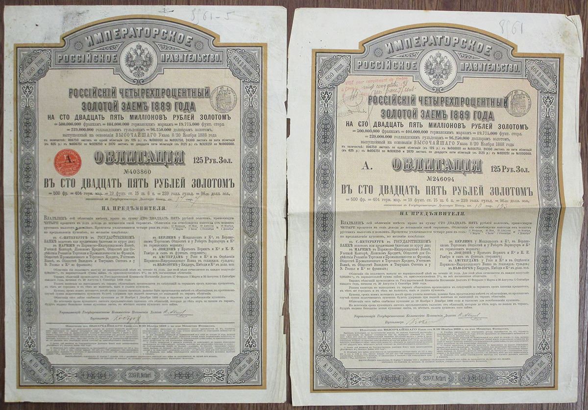 RussiaÉ.. Lot includes 2 pieces: 125 Gold Roubles I/U 4% Gold Coupon Bond in Russian, French, German, and English; 125 Gold Roubles I/U 4% Gold Coupon Bond in Russian, French, German, and English. Both bonds are in Fine condition. (2)