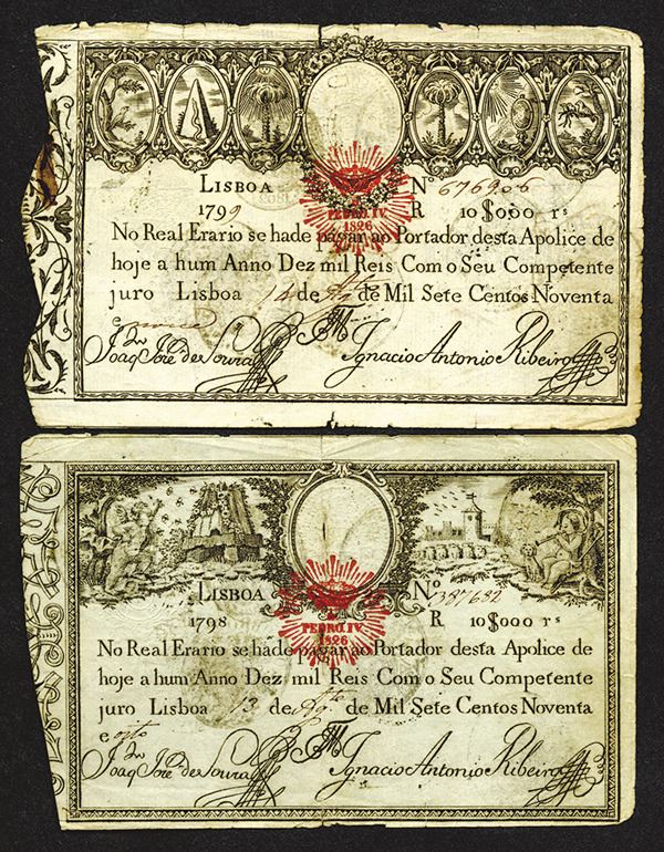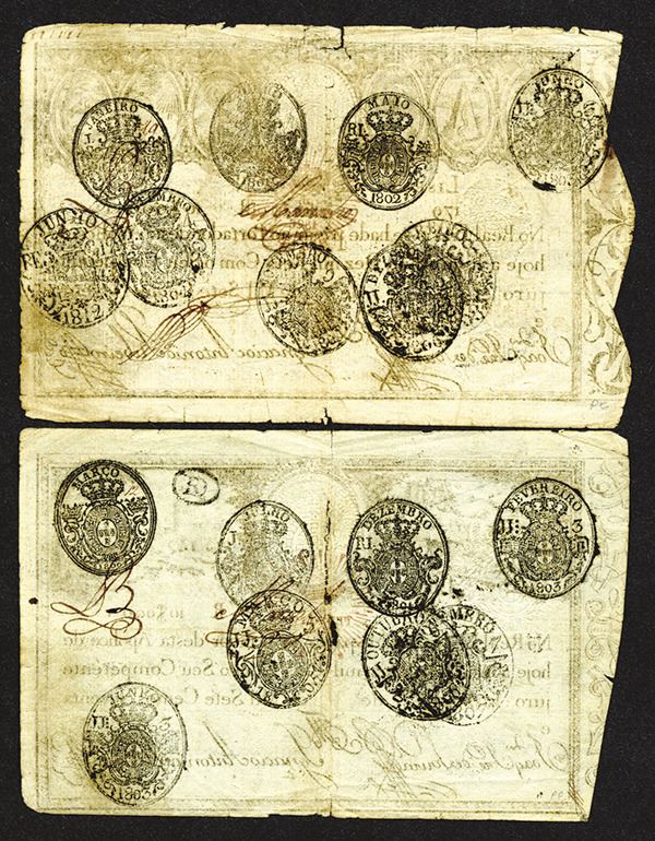 Portugal. 10,000 Reis. P-28, 41a. Numerous hand stamps on back. Very Good or a bit better. Light paper separation at a fold or two. 2 pieces.