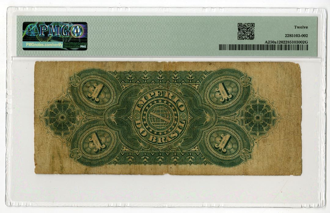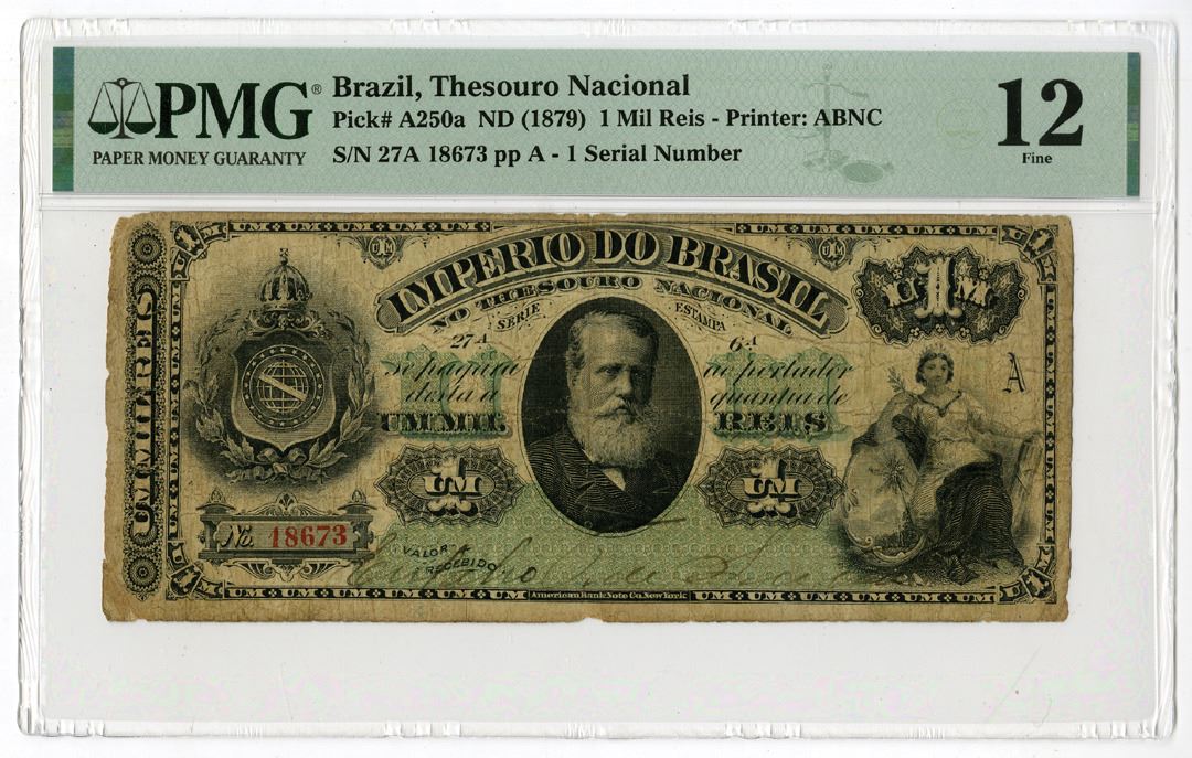 Brazil, ND (1879), 1 Mil Reis, Series A, P-A250a, Issued banknote, Black on light green underprint, Portrait of Dom Pedro II in middle, reclining allegorical woman at right, arms at left, back green. S/N 27A 18673 pp A-1, 1 Serial Number, PMG graded Fine 12, Rare note with only 5 examples graded in the PMG census. ABNC.