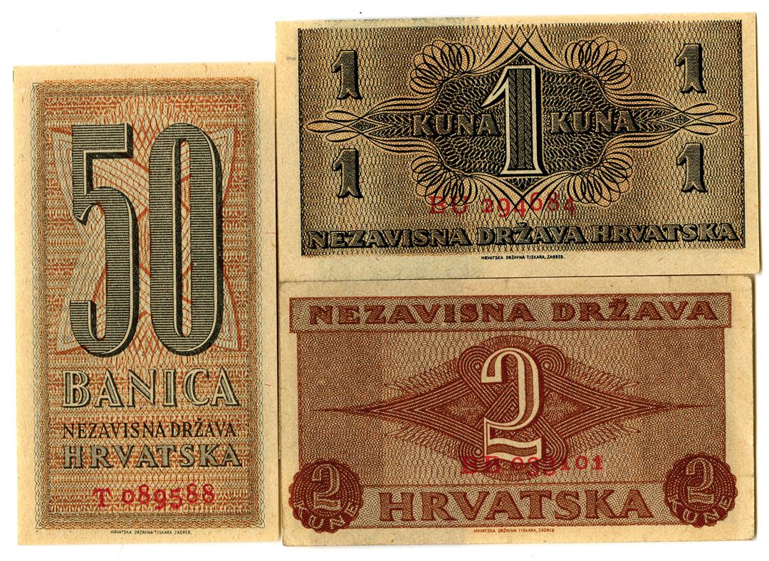 Croatia. 1942. 3 pieces: 50 Banica, P-6a, Issued banknote, Blue on light brown underprint; 1 Kuna, P-7b, Issued banknote, Dark blue on brown; 2 Kune, P-8b, Issued banknote, Dark brown on red-brown underprint. VF to Choice XF condition. (3)