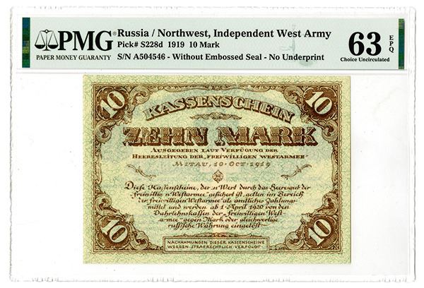 Russia / Northwest. Issued 10 Mark, 1919, P-S228d. Black, Arms at center, S/N A 504546, back Brown on light blue, PMG graded Choice Uncirculated 63 EPQ (Cert # 1956599-005). This is the only example graded in the PMG census and there is no record of ever having been offered at auction previously. Rare note in any condition and first time offered by us.