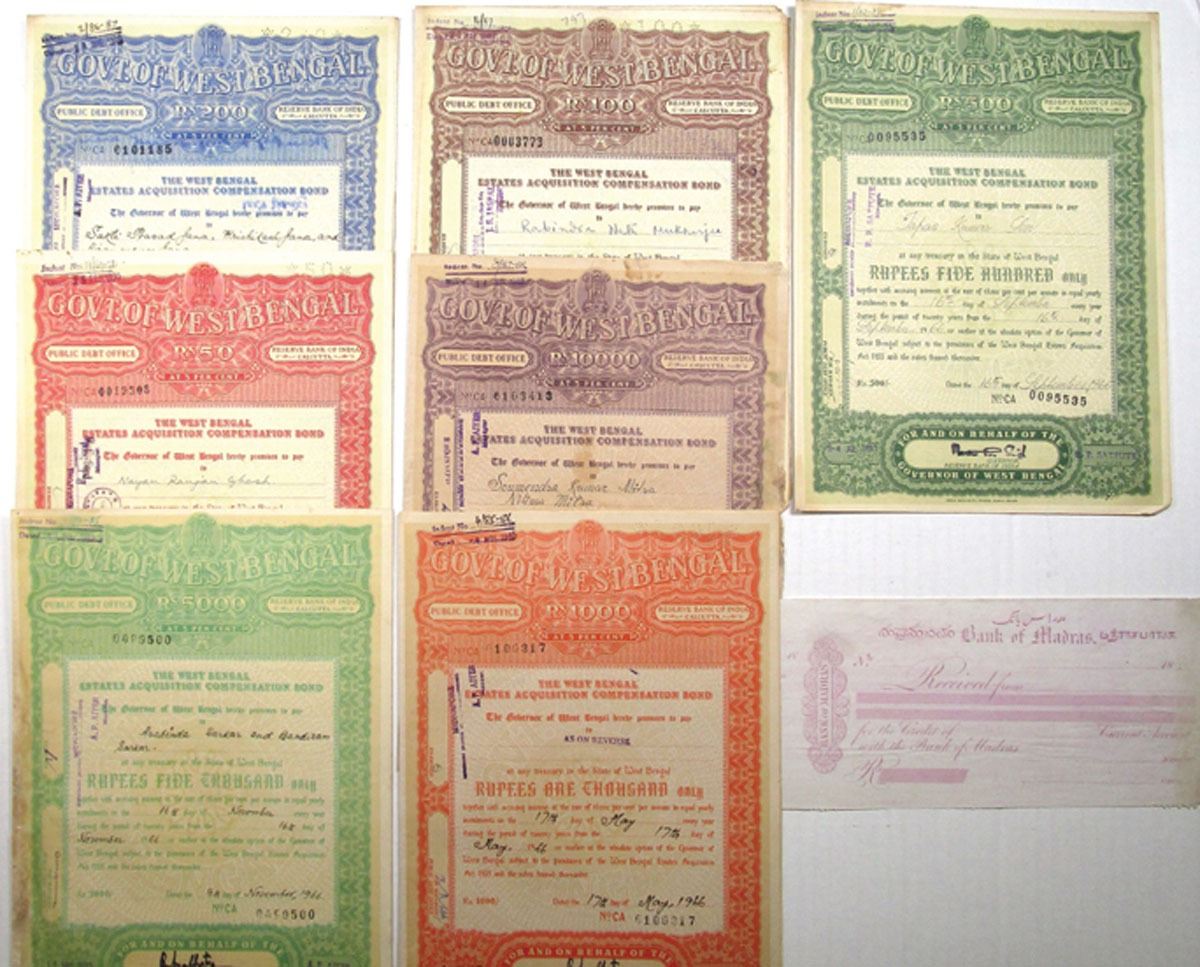 India...., 1880s -1968. Lot of 8 Items, Includes: Bank of Madras Proof Check, Faint purple printing in English and Sanskrit, ca.1880s; Government of West Bengal Group of I/C Bonds: 200 Rupees signed by R N Malhotra; 50, 100, 500, 1000, & 5000 Rupees Signed by L.K. Jha, & P.C. Bhattacharya, Dr. Manmohan Singh, & R N Malhotra; 10,000 Rupees signed by R N Malhotra. Documents range from VF to XF condition. (8). Sold "AS IS" no returns accepted.