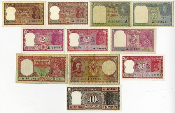 india, Ceylon and Burma, Lot of 11 notes. Includes Ceylon, 2 Rupees, p-35a Fine; Burma, 5 Rupees, P-4. Taylor Sig, VF and 1 Rupee, P-25b; India issues, 2 Rupees, P-17b, VF, scarce; 1 Rupee, P-25a, Unc. And additional issues in VF to Unc.