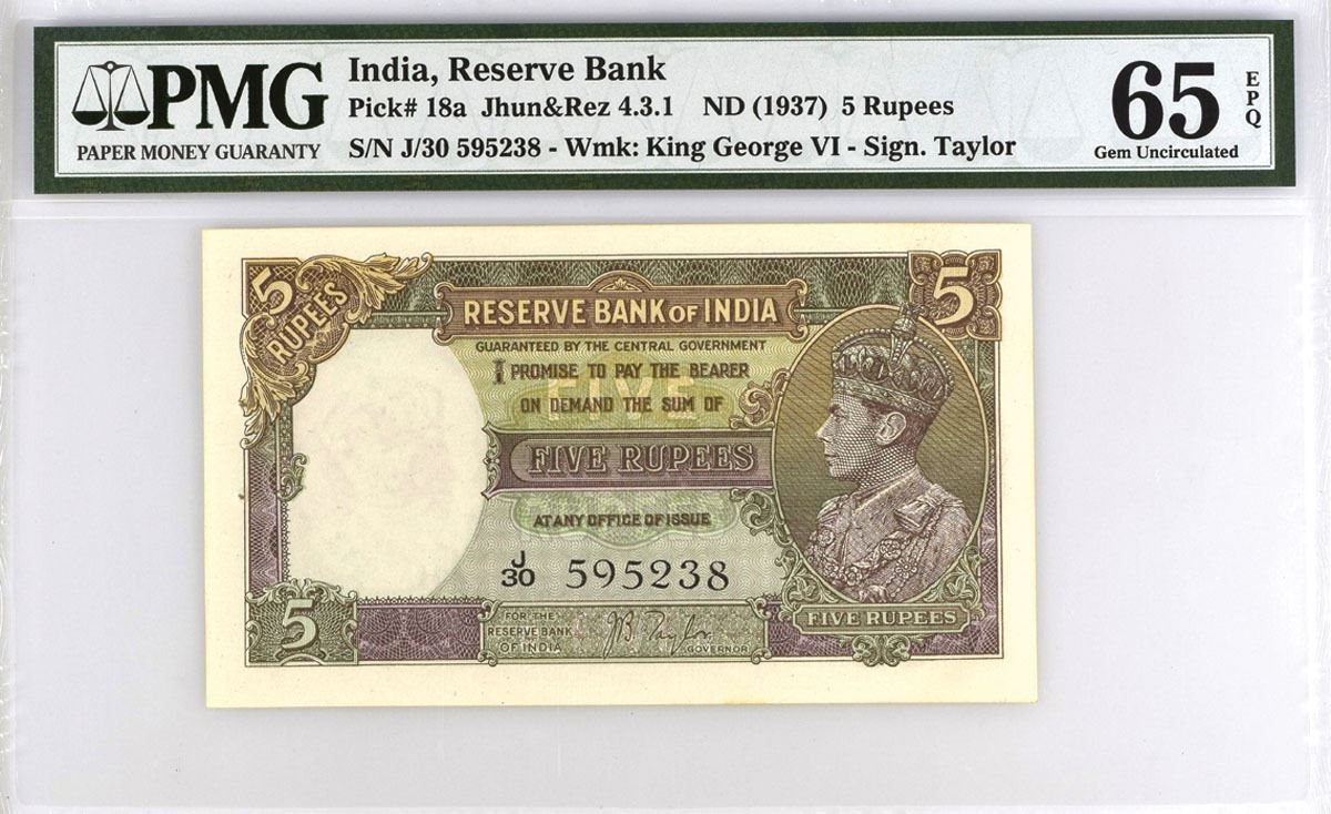 India - British Administration, ND (1937). 5 Rupees, P-18a Jhun&Rez 4.3.1, Issued Banknote, Brown and green on m/c underprint with oval portrait of King George VI at right, Back is brown on m/c, S/N J/30 595238, PMG graded Gem Uncirculated 65 EPQ with comment "Staple Holes at Issue." The note appears in Superb Gem Uncirculated condition with amazing centering and fresh crisp paper as well as large even margins.