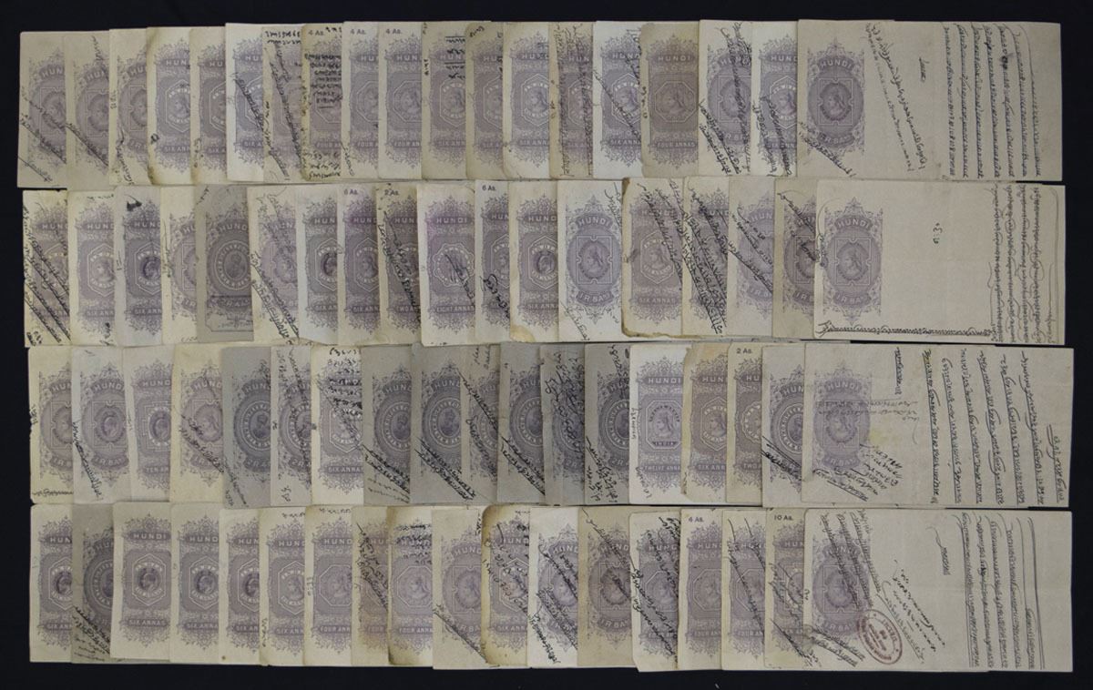 India, ca.1860-1910. Lot of 70+ Hundi promissory notes, Black print with large purple stamp at left side, Urdu writing on front and back, Notes were a traditional Indian financial instrument, a type of promissory note or bill of exchange used for credit and remittances. These were used to borrow money or transfer funds and have been in use for centuries, predating modern banking systems. They rely on a system of honor and custom and were even adopted by the British East India Company. Notes are in VF to VF+ condition. (70+). Sold "AS IS" no returns accepted.