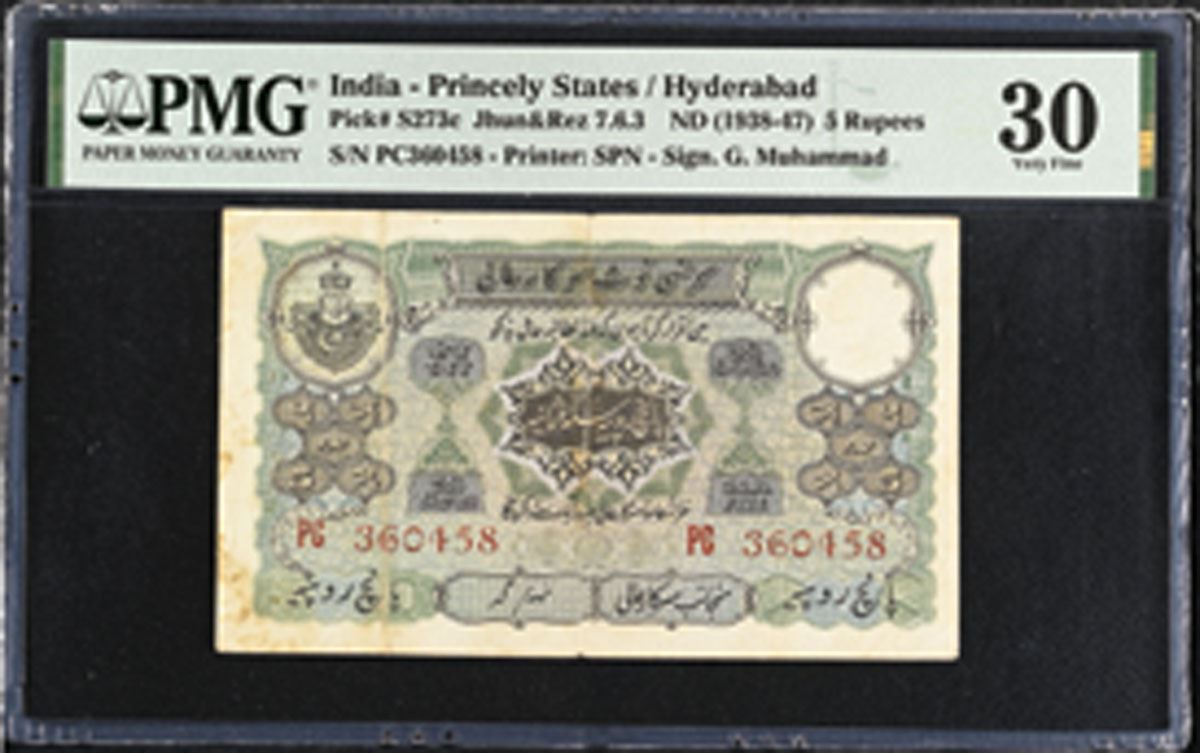 Hyderabad, India, ND (1938-47). 5 Rupees, P-S273c Jhun&Rez 7.6.3, Issued Banknote, Green and m/c printing with Arabic script at center, Back is green with 5 coin design at center, S/N PC360458, PMG graded Very Fine 30 with comments "Staple Holes at Issue, Minor Repaid, Stains," SPN.