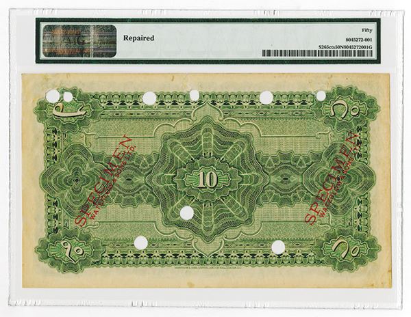 Hyderabad. Color Trial Specimen 10 Rupees, FE 1333 (1922), P-S265, Razack-Jhunjhunwalla 14.67 for type, no serial number, green on pale lilac underprint, featuring coat of arms top corners, signature of Hyder Nawaz Jung low left, reverse green guilloche pattern, value at centre and at each corner, perforated, POC, red SPECIMEN WATERLOW & SONS LTD overprint, PMG About Uncirculated NET with comment "repaired". W&S. Extremely rare.