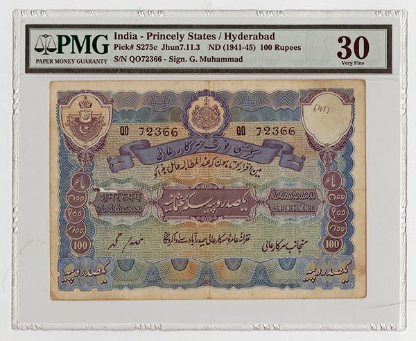 India - Princely States, 100 Rupees, P-S275c, Jhun7.11.3, Issued banknote, face is blue on light blue and brown with seals and arms on top, G. Muhammad signature, the back is blue and red, S/N QO72366, PMG graded Very Fine 30 with note of internal tear and ink as usually found on left middle side, Scarce note.