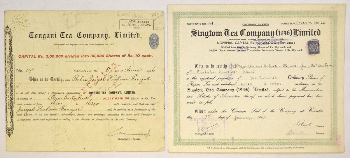 India, 1926-47. Lot of 2 I/U stock certificates from Indian tea plantation companies, Includes: 1926, Tongani Tea Co., Ltd. 100 Shares Certificate; 1947, Singtom Tea Co. Ltd. 100 Shares Certificate following postwar reorganization. Both reflect British-era and early post-independence Indian tea industry. Conditions range from Fine to Very Fine, with age toning and minor handling. (2). Sold “AS IS” no returns accepted.