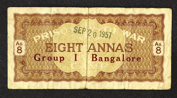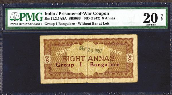 India. 8 Annas. Jhun11.2.5A8A, WWII POW Camp. Group I, Bangalore. With date stamp SEP 20 1957. Mounting residue on uniface back. PMG graded