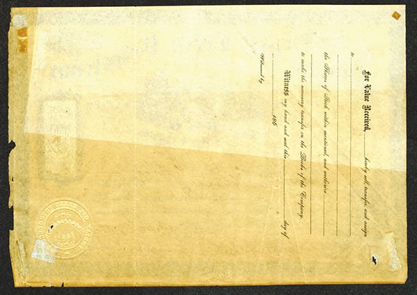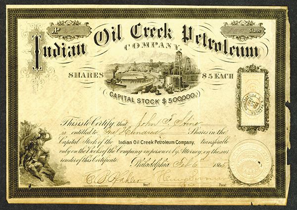 PA. 100 Shares, I/U, Native Americans on lower left with oil wells, ships and oil tanks in middle, light toning, a small hole in one of the letters of the embossed seal, otherwise a very attractive and rare oil company stock from a new find. C&H.
