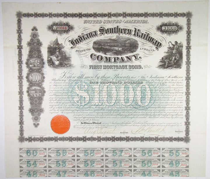 Indiana. $1,000, 1st mortgage, 7%, 30-yr, 1866, due 1896, bearer coupon bond, Black on green underprint, orange corporate seal at lower left, train under ornate title at top flanked by allegorical figures on left and right, counterfoil on left with ornate engravings and steamboat and train, horizontal format, by Major & Knapp, Signed on the back by Samuel J Tilden, trustee. Samuel Jones Tilden (February 9, 1814 – August 4, 1886) was an American politician who served as the 25th Governor of New York and was the Democratic candidate for president in the disputed 1876 United States presidential election. Tilden was the second presidential candidate to lose the election despite winning the popular vote and is the only candidate to win a majority of the popular vote in a United States presidential election (50.9%), but lose the election.
