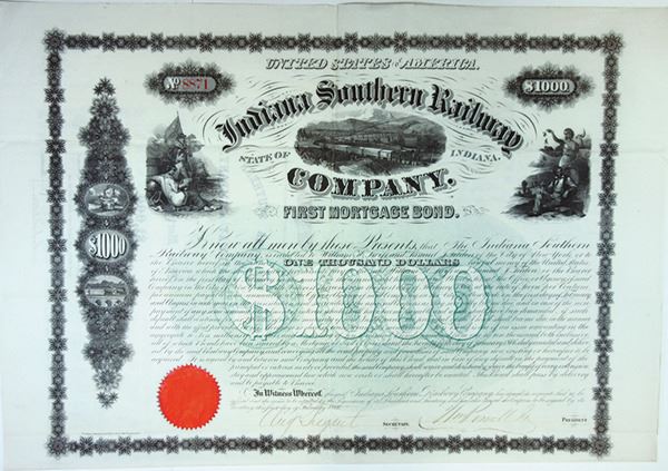Indiana. $1,000 I/U 6% 1st Mortgage Coupon Bond, Black print on oversized certificate with black border and green under tint, Locomotive at top under title with allegorical figures flanking, VF-XF condition, Major & Knapp.