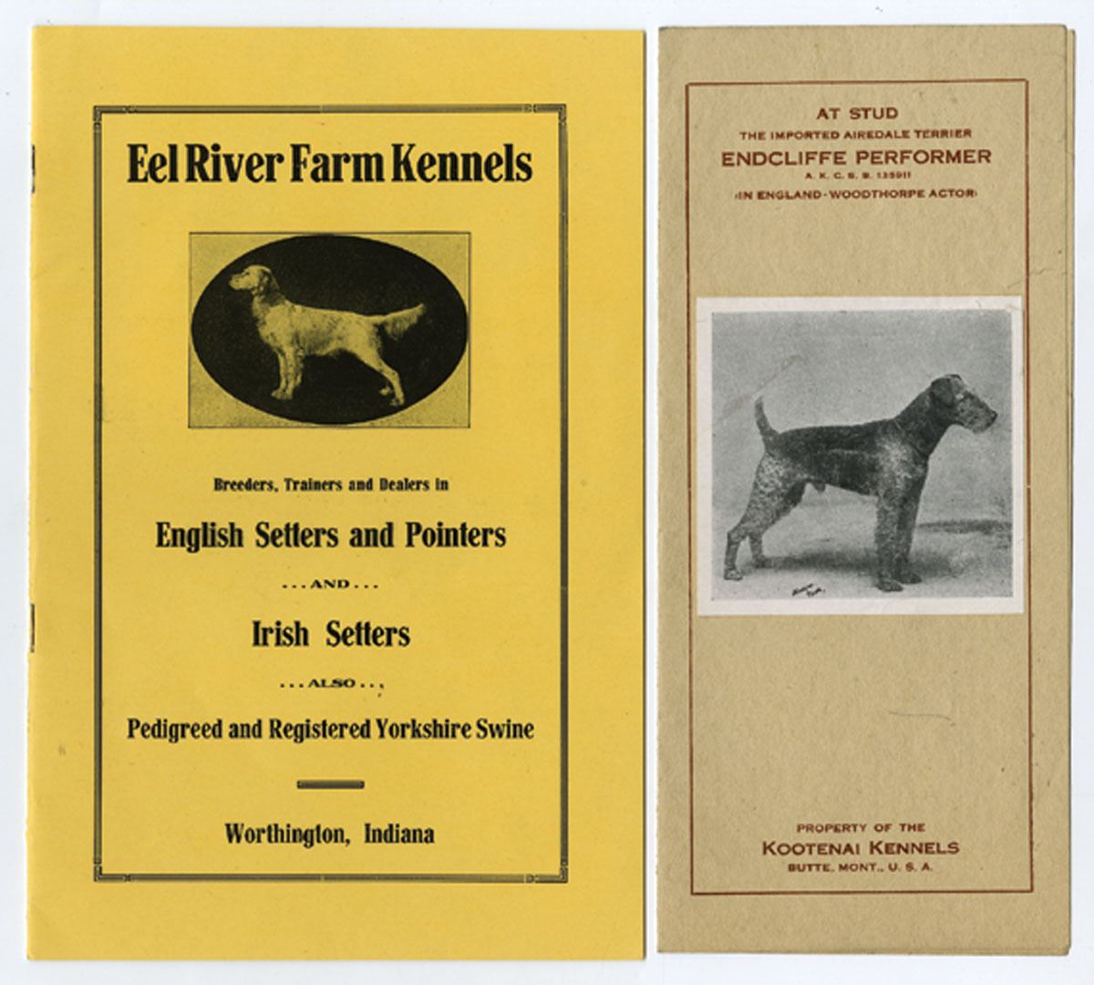Indiana and Montana, 1906-11. Lot of 2 Dog Breeding Pamphlets: Airedale Terrier from the Kootenai Kennels in Butte Montana and English Setters and Pointers and Irish Setters (also Pedigreed and Registered Yorkshire Swine) from Eel River Farm Kennels in Worthington Indiana. Both pamphlets are in VF to XF condition. (2). Sold "AS IS" no returns accepted.