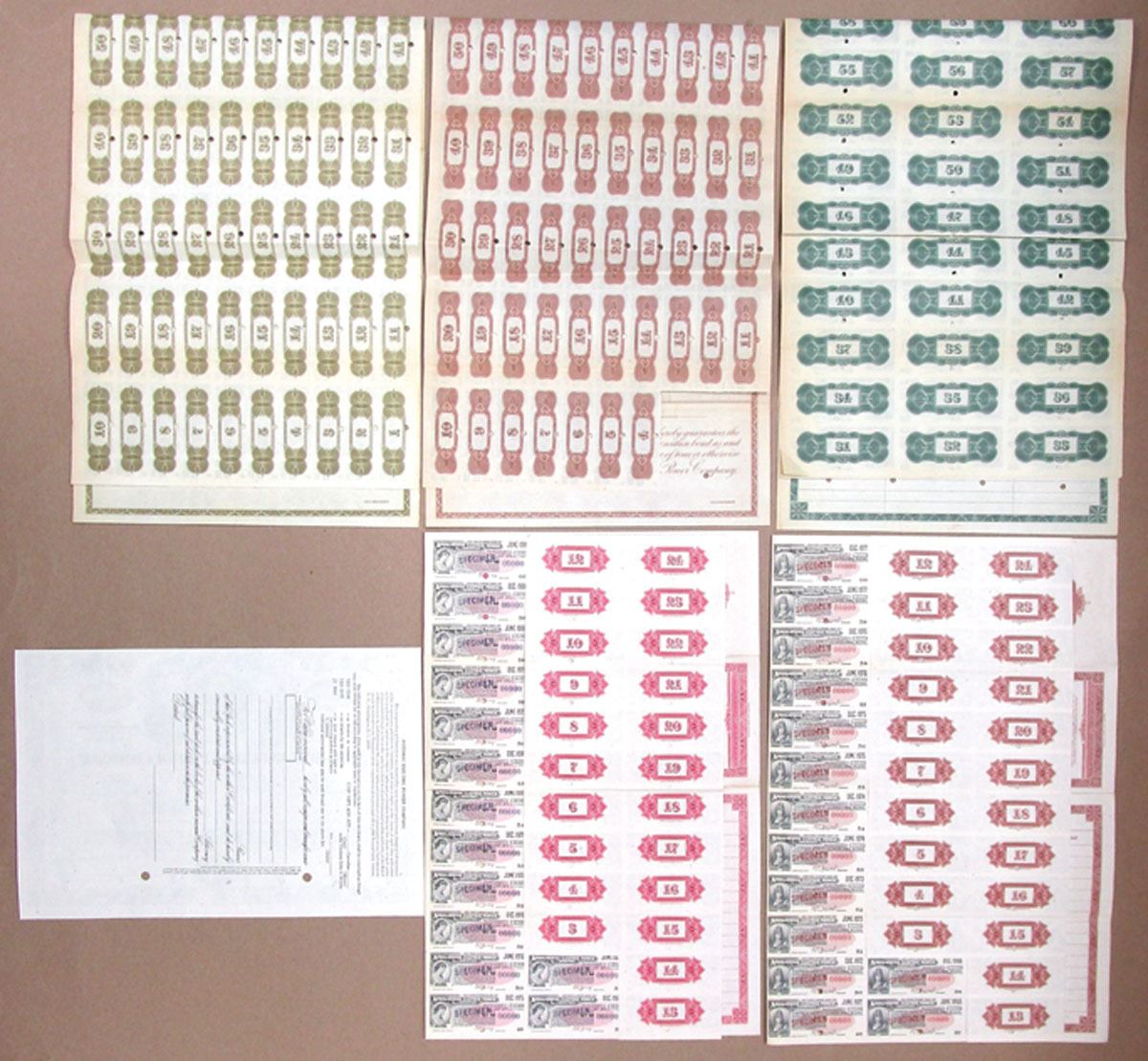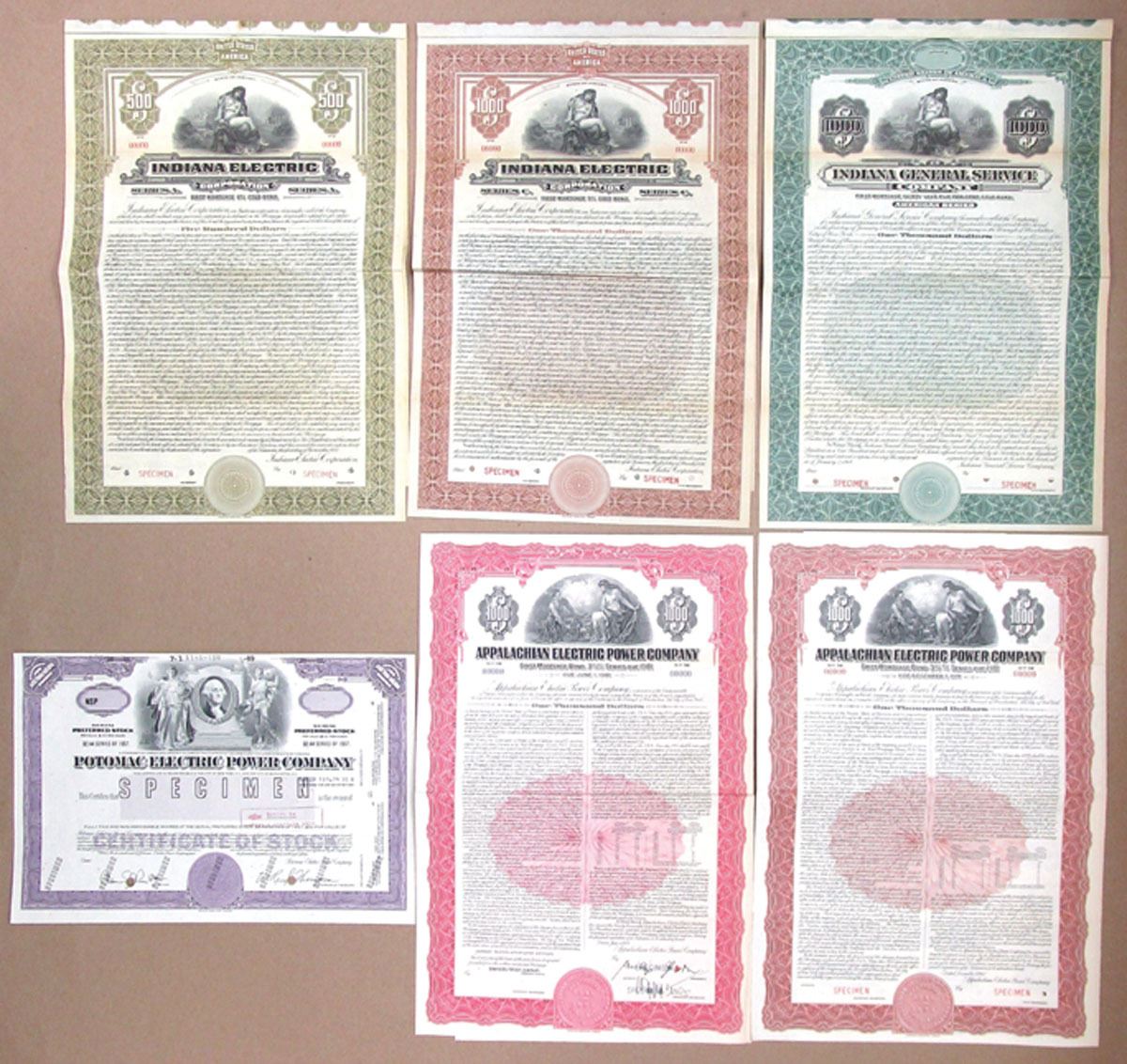 Indiana and Virginia, 1918-89. Lot of 6 Specimen Certificates, Includes: Indiana General Service Co. $1000 Coupon Bond, 1918; Indiana Electric Corp. $500 Coupon Bond, 1922; $1000 Coupon Bond, 1926; Appalachian Electric Power Co. $1000 Coupon Bond, 1947; $1000 Coupon Bond, 1951; Potomac Electric Power Co. Specimen Stock Certificate, 1989. Documents range VF to AU condition. (6). Sold "AS IS" no returns accepted.