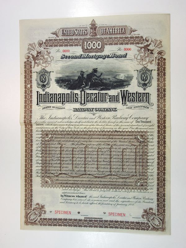 Indiana & Illinois. $1,000 Specimen 5% 2nd Mortgage Coupon Bond, Native Americans at top watching locomotive going past, Black print on brown border and under tint, Fine-VF condition with minor splitting at fold lines, ABNC.