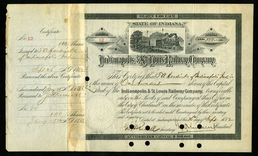 Indianapolis, IN. 1882, 100 Shares, I/C, S/N 12, ITASB Thomas Andrews Hendricks (1819 Ð1885) was an American politician and lawyer from Indiana who served as the 16th governor of Indiana from 1873 to 1877 and the 21st vice president of the United States from March to November 1885. Hendricks represented Indiana in the U.S. House of Representatives (1851Ð55) and the U.S. Senate (1863Ð69). In addition, Hendricks served as commissioner of the General Land Office (1855Ð59). Hendricks, a popular member of the Democratic Party, was a fiscal conservative. He defended the Democratic position in the U.S. Senate during the American Civil War and Reconstruction era and voted against the Thirteenth, Fourteenth, and Fifteenth Amendments to the U.S. Constitution. He also opposed Radical Reconstruction and President Andrew Johnson's removal from office following Johnson's impeachment in the U.S. House. Rare signature. VF.