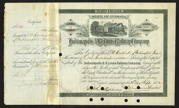 Indianapolis, IN. 1882, 100 Shares, I/C, S/N 12, ITASB T.A. Hendricks who was Vice President under Grover Cleveland from March to November 1885 when he passed away unexpectedly. Rare signature. VF.