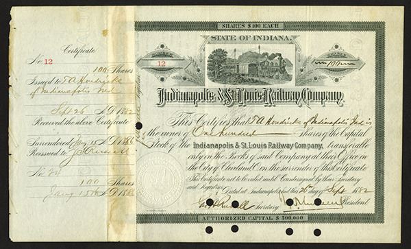 Indianapolis, IN. 1882, 100 Shares, I/C, S/N 12, ITASB T.A. Hendricks who was Vice President under Grover Cleveland from March to November 1885 when he passed away unexpectedly. Rare signature. VF. (From the collection of John E. Herzog)