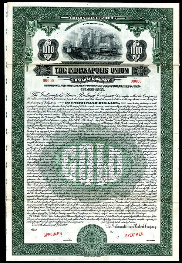 Indianapolis Union Railway Co., 1930, $1000 Specimen Gold Coupon Bond. Indiana. 1930, $1000, Specimen 4 1/2% Gold Bond, Black on green border and underprint, ABNC. Specimen only, unknown issued in Cox.