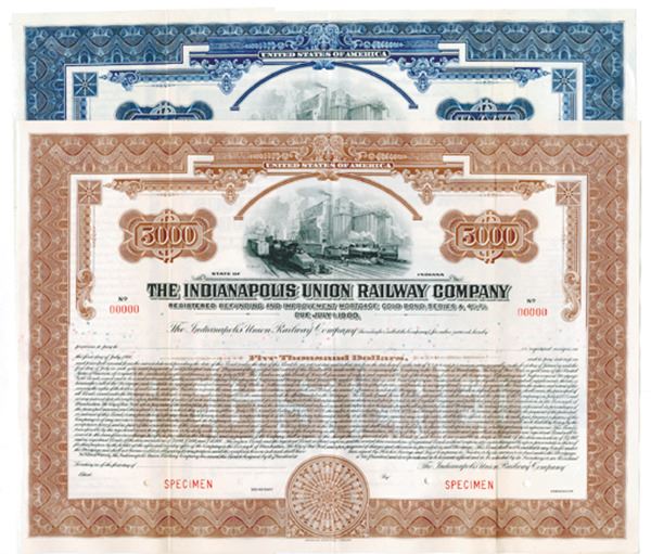 Indiana. Lot of 2 Specimen Registered Refunding and Improvement Mortgage Gold Bonds Due July 1, 1980. includes $5000 brown and $10,000 blue. Both horizontal format, trains, with stubs, Uncirculated, POC's, folded in fourths as made. The $10,000 denomination is listed in Cox, the $5,000 is an unlisted discovery type. ABNC.