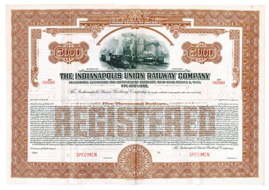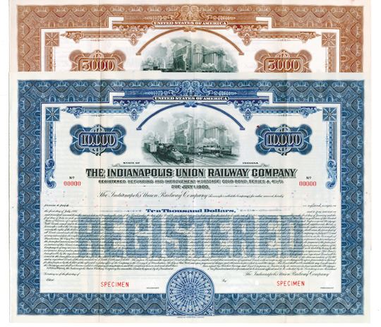 Indiana. 193, Lot of 2 Specimen Registered Refunding and Improvement Mortgage Gold Bonds. Includes $5000 brown and $10,000 blue. Both horizontal format, trains, with stubs, Uncirculated, POC's, folded in fourths as made. The $10,000 denomination is listed in Cox, the $5,000 is an unlisted discovery type. ABNC. (2)