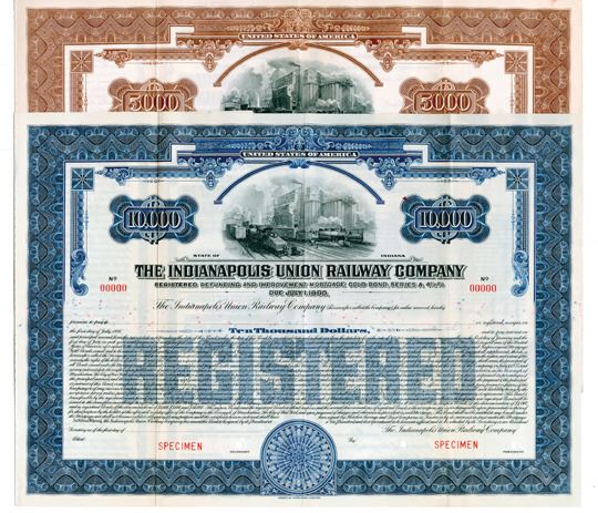 Indiana. 193, Lot of 2 Specimen Registered Refunding and Improvement Mortgage Gold Bonds. Includes $5000 brown and $10,000 blue. Both horizontal format, trains, with stubs, Uncirculated, POC's, folded in fourths as made. The $10,000 denomination is listed in Cox, the $5,000 is an unlisted discovery type. ABNC. (2)