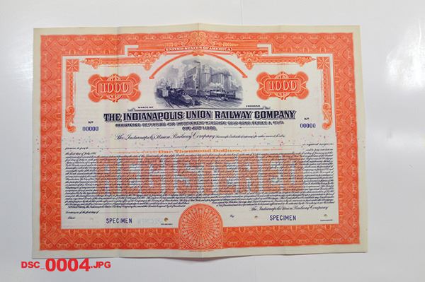Indiana. $1000 Specimen Series A 4 1/2% Registered Refunding and Improvement Mortgage Gold Bond, Black print on orange border and under tint in horizontal format, Image of locomotives at top, Specimen overprints and POC's, VF-XF condition, ABNC.