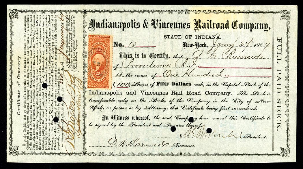 Indiana, 1869, Indianapolis & Vincennes Railroad Co. 100 Shares, $50 each, Capital, Stock Certificate. VF Condition. The certificate is ITASB Ambrose E Burnside as president and endorsed on the back. Burnside was the well known Union General. The term side burns originated with Burnsides distinctive facial hair.