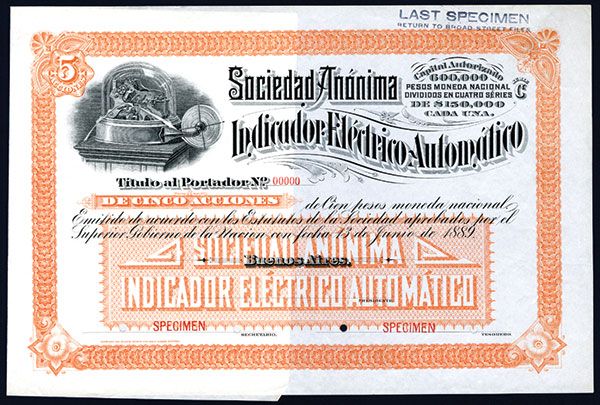 Argentina. 1889. Specimen Stock. Vignette top left of early stock ticker machine. POC's and red SPECIMEN overprints. VF-XF condition. ABNC. Rare certificate with either stock ticker or telegraph related machine.