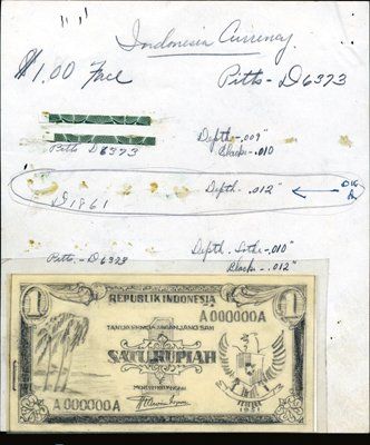 1950-51 (1951 Issue). P-38 Unlisted. 1 Rupiah Unique Face and Back hand drawn in pencil, essay models, very similar to the rejected P-38, 1951 issue, with eagle instead of rice fields on right. Both face and back are laminated in plastic and stapled to larger pieces of paper with design elements, borders and text relating to the design of the banknote. VF condition. SBNC.