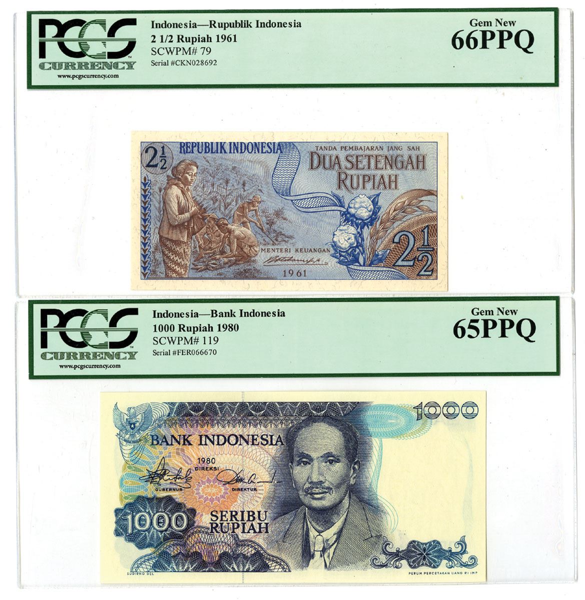 Indonesia, 1961 and 1980. Lot of 2 Issued Banknotes, Includes: 1961, Republik Indonesia 2 1/2 Rupiah, P-79, S/N CKN028692, PCGS graded Gem New 66PPQ; 1980, Bank Indonesia, P-119, S/N FER066670, PCGS graded Gem New 65PPQ. (2). Sold "AS IS" no returns accepted.