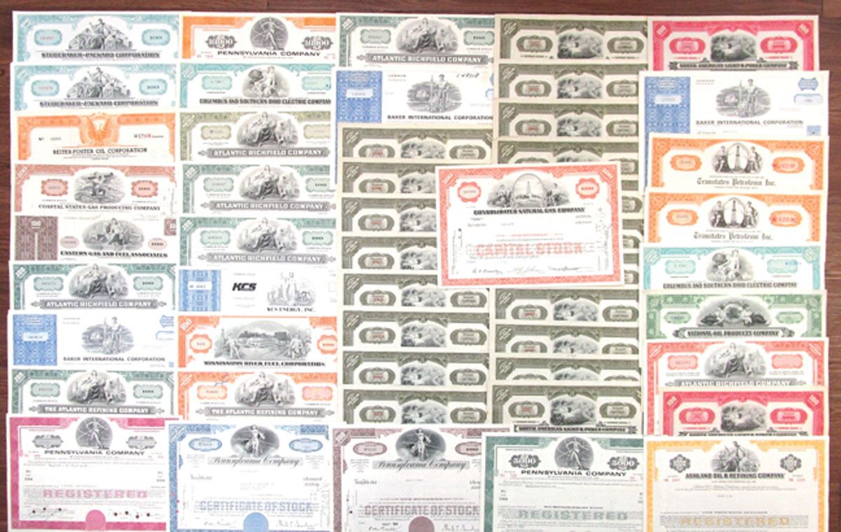 Lot of 50 Stock and Bond Certificates, Highlights Include: North American Light & Power Co., Pennsylvania Co., Atlantic Richfield Co., Studebaker-Packard Corp., Atlantic Refining Co., Ashland Oil & Refining Co. and more. Certificates range from Fine to VF+ condition. (50). Sold "AS IS" no returns accepted.