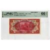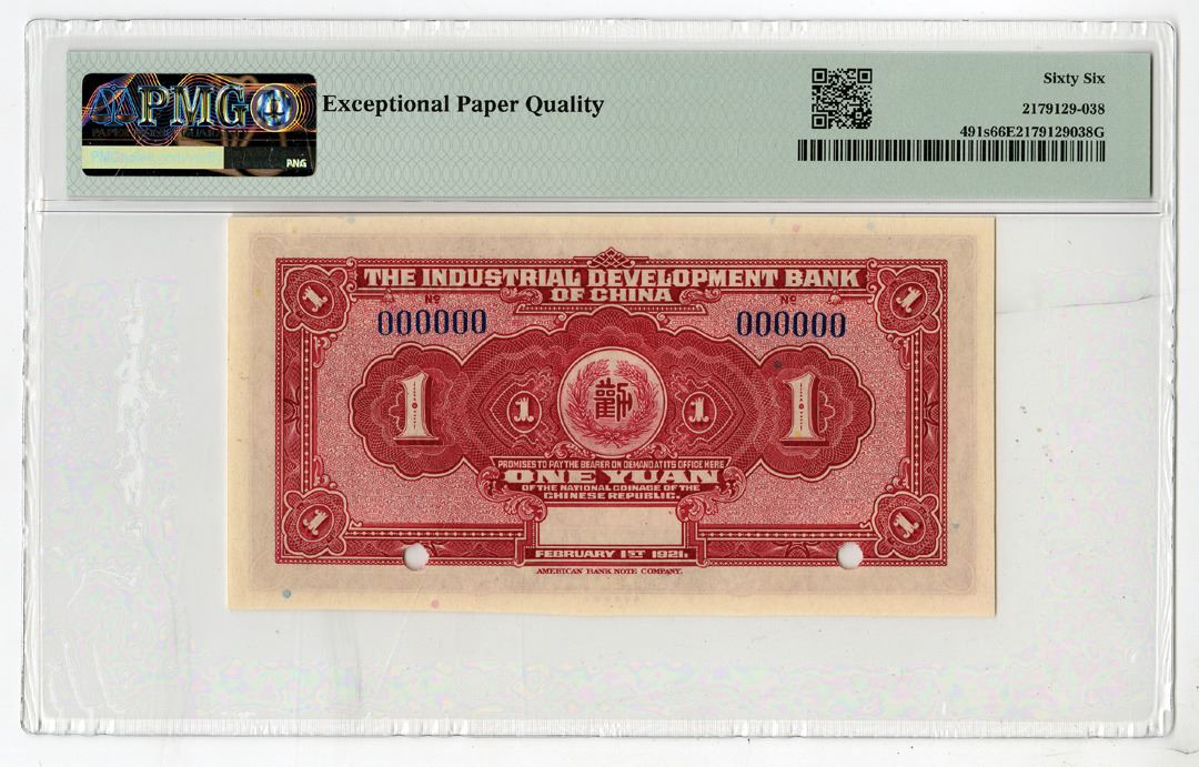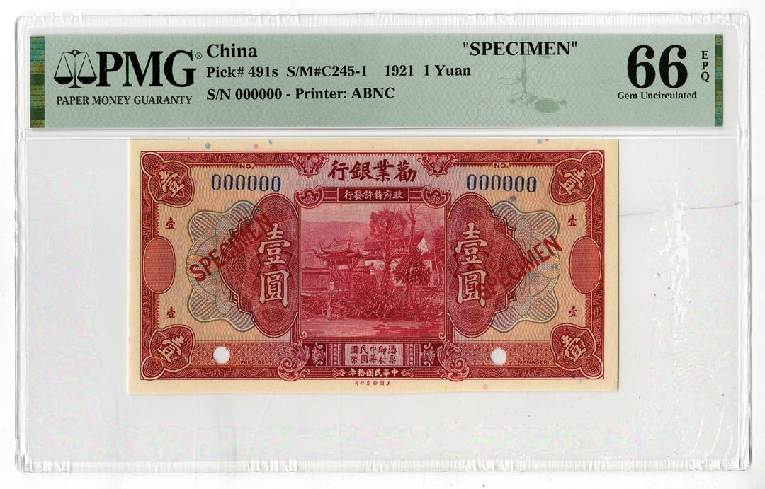 China, 1921. 1 Yuan, P-491s, S/M#C245-1, Specimen Banknote, Red on m/c underprint with house at center, Specimen overprints and Poc's, S/N 000000, PMG graded Gem Uncirculated 66 EPQ. Printer: ABNC. Only 2 notes grade higher out of 20 notes graded in the PMG census. None have been offered at auction since 2019.