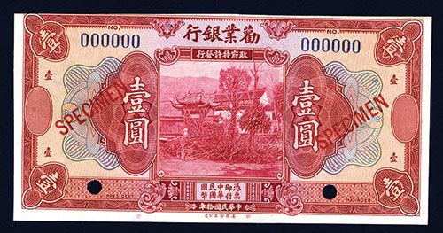 1921, 1 Yuan, P-491s, (S/M #C245-1-), Specimen banknote, face red and m/c with village gateway and building at center, back red, Choice AU to Uncirculated but close on top and just barely touCh’ing design on the top left border, Scarce as specimen. ABNC.