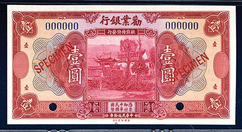 1 Yuan, P-491s, (S/M #C245-1), Specimen banknote, face red and m/c with village gateway and building at center, back red, PMG graded Gem Uncirculated 66 EPQ (Exceptional Paper Quality). Attractive note with jumbo margins and not usually seen in Gem grade. ABNC. Only one note graded slightly higher out of a total of eight in the PMG census.