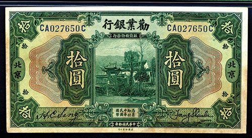 Peking, China, 1928. 10 Yuan, P-495a, (S/M#C245-5b), Issued banknote, Dark green on multicolor underprint, Black back, Red “P” at top left on back, S/N CA027650C, ABNC, PMG graded About Uncirculated 50 NET with note on previous mounting and light stains on margins.