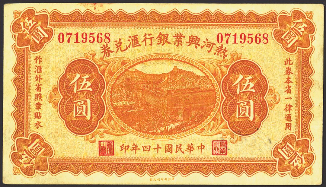 China 1925, 5 Yuan, P-S2187a (S/M#J1-71a), Issued banknote, Yellow-Orange with Great Wall, back Orange-Yellow, Signature of P.C. Kao, PMG graded About Uncirculated 53. (From the Allen Berk Collection)