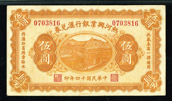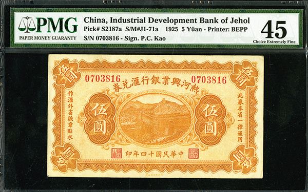 China, 5 Yuan, P-S2187a S/M#J1-71a, Issued, Yellow-orange, great Wall at center, back the same color, S/N 0703816, PMG graded Choice Extremely Fine 45 condition. BEPP. (Pogrebetsky Family Archives, Part 2)