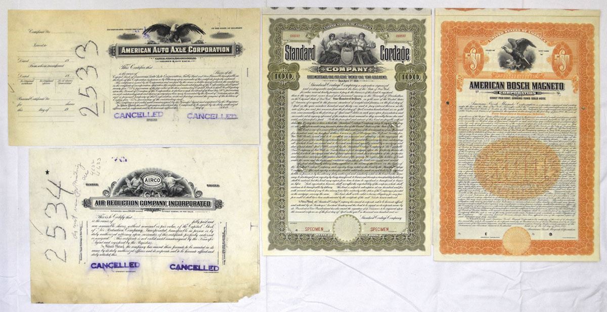 Various States, 1900s to 1930s. Lot of 4 certificates including 2 Specimen bonds and 2 Proof stock certificates, Includes: Standard Cordage Co. $100 Specimen First Mortgage 5% Gold Bond, American Bosch Magneto Corp. $500 Specimen 8% Sinking Fund Gold Note, American Auto Axle Corp. Proof Stock Certificate, and Air Reduction Co., Inc (AIRCO) Proof Stock Certificate. Engraved designs feature American eagle vignettes, allegorical figures, and ornate industrial-era borders. Specimen pieces display overprints; proof certificates show cancellation markings and production annotations. A strong cross-section of automotive, manufacturing, and industrial gas enterprises from the early 20th century. Conditions range from Good to Extremely Fine with staining, edge wear, and handling as seen. (4). Sold ‘AS IS’ no returns accepted.