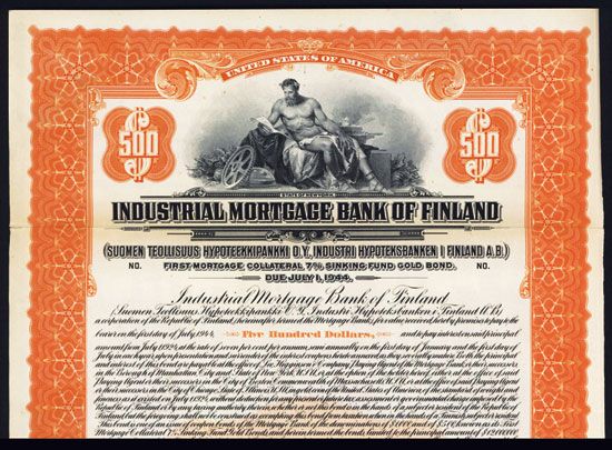 New York, 1924, $500, 1st Mortgage Collateral 7% Sinking Fund Gold Specimen Bond, Black on orange border and underprint, Older allegorical figure reclined top center and reading script, Red SPECIMEN overprints and POC's, Coupons attached, Red SPECIMEN overprints and POC's, VF-XF condition, ABNC. Scarce.