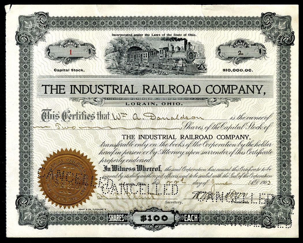 Lorain Ohio, 1903, Industrial Railroad Co. 2 Shares, $100 each, Capital, Stock Certificate, VF Condition. Scarce railroad and unique #1 serial number.