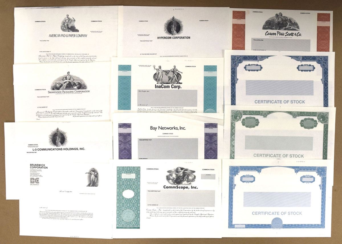 Lot of 12 items, featuring American Pad & Paper Company, a leading manufacturer of office paper products and writing pads, border in blue; Hypercom Corporation, a provider of electronic payment and point-of-sale systems, border in green; Shorewood Packaging Corporation, a specialty packaging company serving consumer goods and entertainment industries, border in teal; Brunswick Corporation, a diversified manufacturer known for recreational products including marine engines, boats, and fitness equipment, border in red; L-3 Communications Holdings Inc., a major defense contractor and supplier of communication and surveillance systems, border in blue; InaCom Corp., a former IT services and computer distribution company, border in blue; Bay Networks Inc., a networking hardware company later acquired by Nortel, border in green; CommScope Inc., a global provider of infrastructure solutions for communications networks, border in teal; Carson Pirie Scott & Co., a historic U.S. department store chain based in Chicago, border in red;. All are face-only stock certificate proofs or specimens with blank reverses; overall condition is Very Fine to Uncirculated (12).