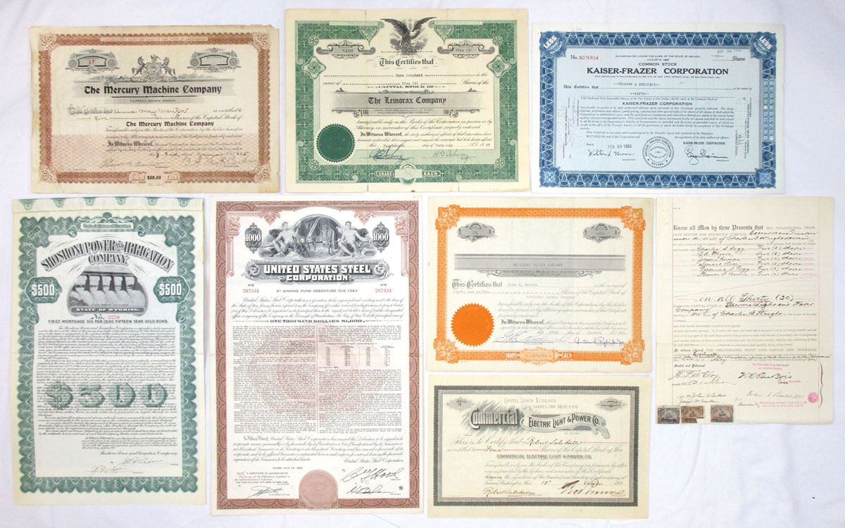 Lot of 8 Stock and Bond Certificates representing industrial manufacturing, automotive, utilities, transportation, and finance, Includes: Mercury Machine Co.; Lemorax Co.; Kaiser-Frazer Corp.; Shoshone Power & Irrigation Co.; United States Steel Corp.; Commercial Electric Light & Power Co., and related issuers. Group consists of both stock certificates and bonds, with engraved designs featuring allegorical figures, industrial scenes, eagles, and period typography. Conditions range from VG to XF overall, with typical folds, cancellations, stamps, and handling wear present. (8). Sold “AS IS” no returns accepted.