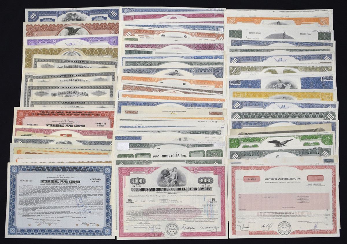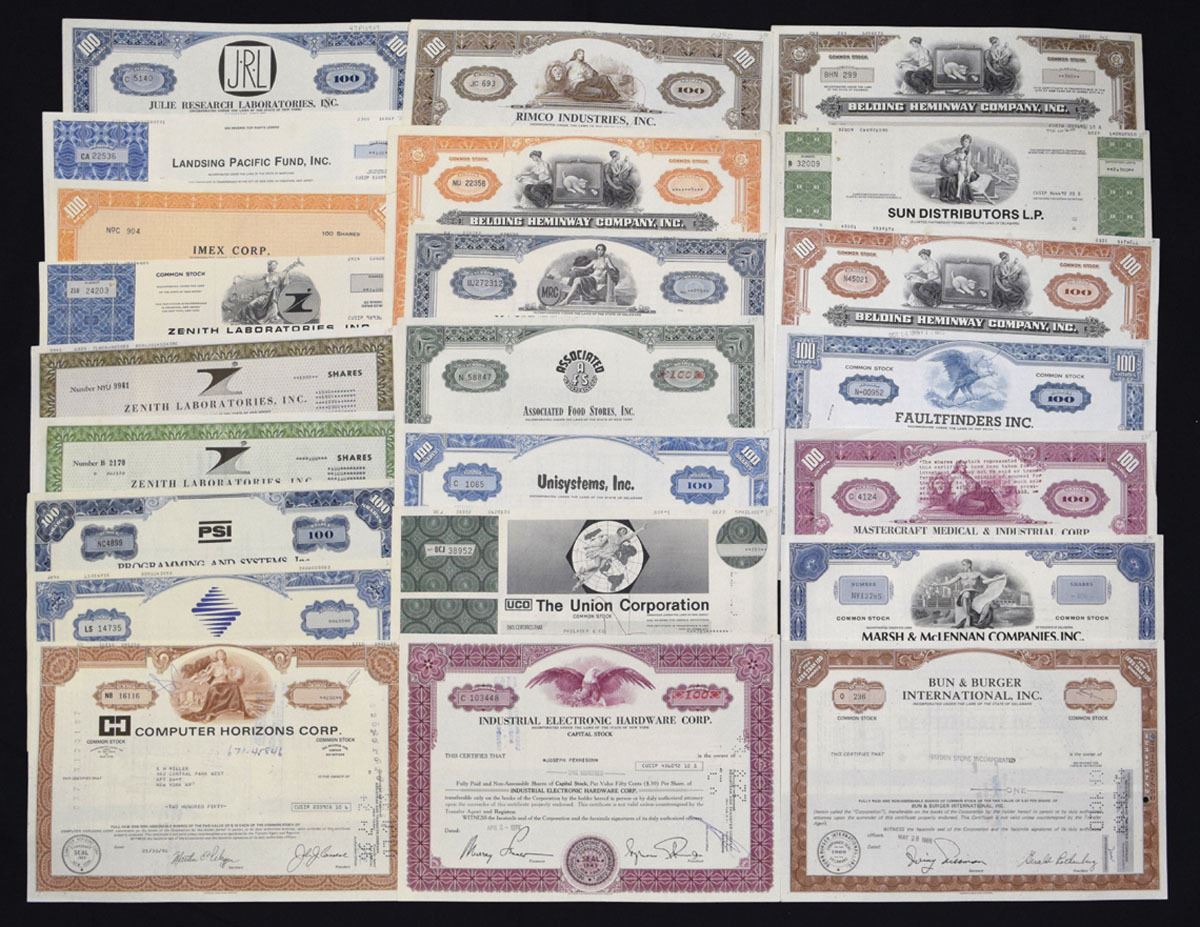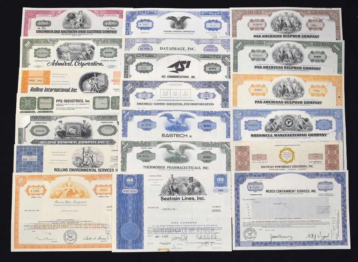 Various States, ca. 1850s-1900s. Lot of 60+ Issued, Unissued, Cancelled, and Remainder Stock Certificates representing American companies across diverse sectors including oil, utilities, chemicals, consumer goods, electronics, transportation, manufacturing, and finance, Includes: International Telephone & Telegraph Corp., International Paper Co., Socony Mobil Oil Co., Illinois Oil Co., Oklahoma Oil Co., Hydraulic Press Brick Co., The Brainerd Water Co., Columbus & Southern Ohio Electric Co., Pan American Sulphur Co., Rockwell Manufacturing Co., Seatrain Lines Inc., PPG Industries, Inc., Thermobios Pharmaceuticals Inc., Admiral Corp., Data Image Inc., ASI Communications Inc., Zenith Laboratories, Inc., Computer Horizons Corp., Marsh & McLennan Companies Inc., General Stores Corp., Cinerama Inc., Ronson Corp., Dennison Manufacturing Co., Lum’s Inc., Metro-Tel Corp., and many others. Certificates feature a range of ornate engraved vignettes including allegorical figures, eagles, industrial scenes, and corporate logos, with a spectrum of border colors. Condition varies from Fine to AU, with multiple bright, well-preserved examples. An impressive grouping that showcases a cross-section of American industry and corporate history from the early to late 20th century. (60+). Sold "AS IS" no returns accepted.